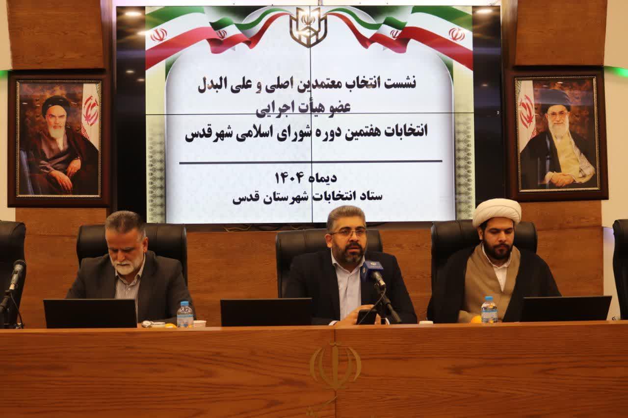 به گزارش روابط عمومی فرمانداری شهرستان قدس، در جلسهای به ریاست علیرضا فاتحینژاد فرماندار و با حضور اعضای حقوقی هیئت اجرایی، اعضای ستاد انتخابات، رئیس هیئت نظارت، هشت نفر از معتمدین به عنوان اعضای اصلی و پنج نفر نیز بعنوان اعضای علی البدل هیئت اجرایی انتخابات شورای اسلامی شهر قدس انتخاب شدند. اسامی اعضای اصلی هیئت اجرایی به شرح زیر است: حسین حسین با ۲۵ رأی محسن چیبایی با ۲۱ رأی پرویز هاشمی با ۲۱ رأی حسین کولیوند با ۲۰ رأی حسین جریته با ۱۹ رأی محمدحسین رضازاده با ۱۶ رأی مهران پیرانی با ۱۶ رأی رامین جلیلهوند با ۱۶ رأی