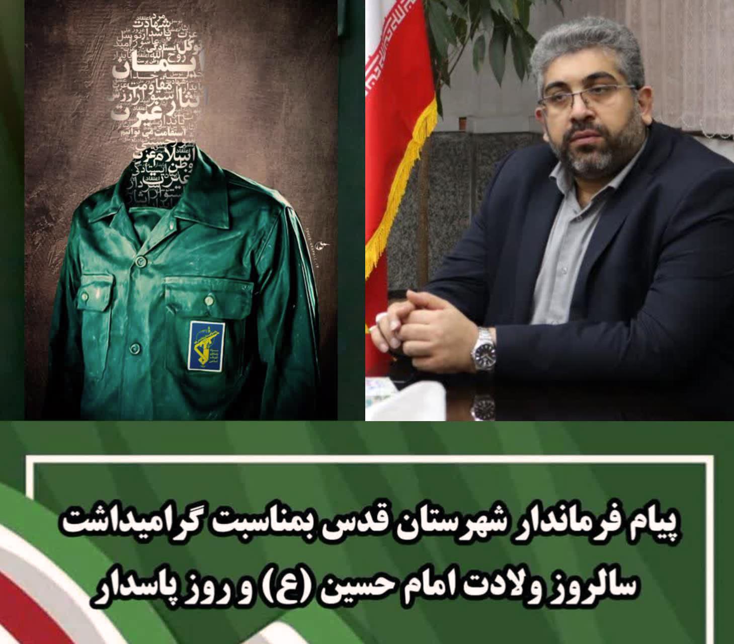 در این روز بزرگ، از درگاه ایزد منان برای تمامی پاسداران، جانبازان و شهیدان این نهاد سترگ، به ویژه شهیدان گرانقدر شهرستان قدس، علو درجات و برای خانواده‌های محترم آنان صبر و اجر مسألت دارم.