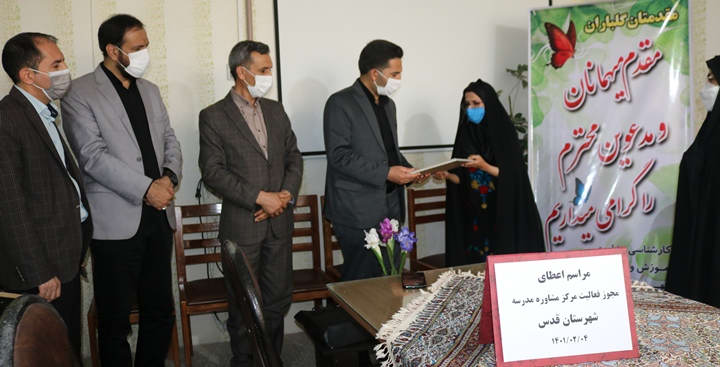 اعطای مجوز فعالیت مرکز مشاوره مدرسه شهرستان قدس با حضور نرگس خاتون شاکری رییس مرکز مشاوره شهرستانهای استان تهران ،محمود وطن دوست، کارشناس مسئول اداره مشاوره تربیتی و تحصیلی اداره کل آموزش و پرورش شهرستان های استان تهران و وحید محرمی، مدیر آموزش و پرورش شهرستان قدس در مرکز مشاوره مدرسه شهرستان قدس برگزار شد.