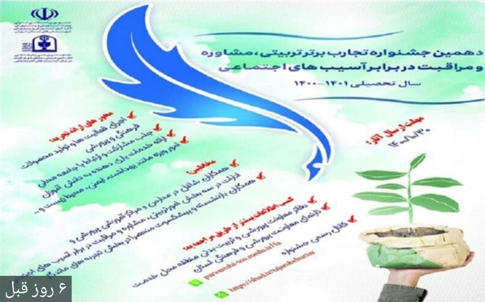 به گزارش دفتر اطلاع رسانی و روابط عمومی مدیریت آموزش و پرورش شهرستان قدس، مهدی چیوایی، معاون پرورشی و تربیت بدنی ضمن اعلام این خبر گفت: جشنواره تجارب برتر تربیتی و مراقبت در برابر آسیب های اجتماعی با هدف میل به تحقیق، تولید محتوا و مشارکت اولیا با جامعه محلی، امور ویژه راهبردی مانند بهداشت، ایمنی، محیط زیست، و مخاطبین آنها همکاران شاغل در مدارس، مراکز آموزش و پرورش ( تربیتی، مراقبتی و مشاوره) همکاران بازنشسته و پیشکسوت منحصرا در بخش تجربه های ماندگار انجام میپذیرد.