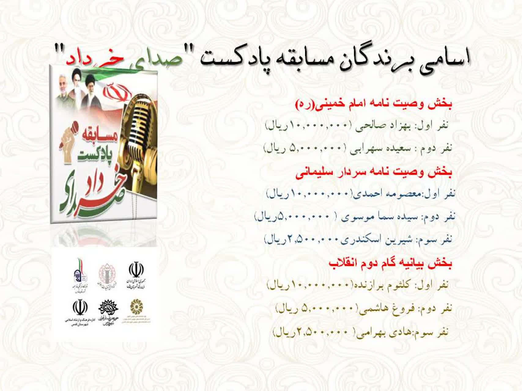 بخش بیانیه گام دوم انقلاب :نفر اول کلثوم برازنده(10,000,000ریال) نفر دوم فروغ هاشمی(5,000,000 ریال):نفر سوم هادی بهرامی( 2,500,000ریال)