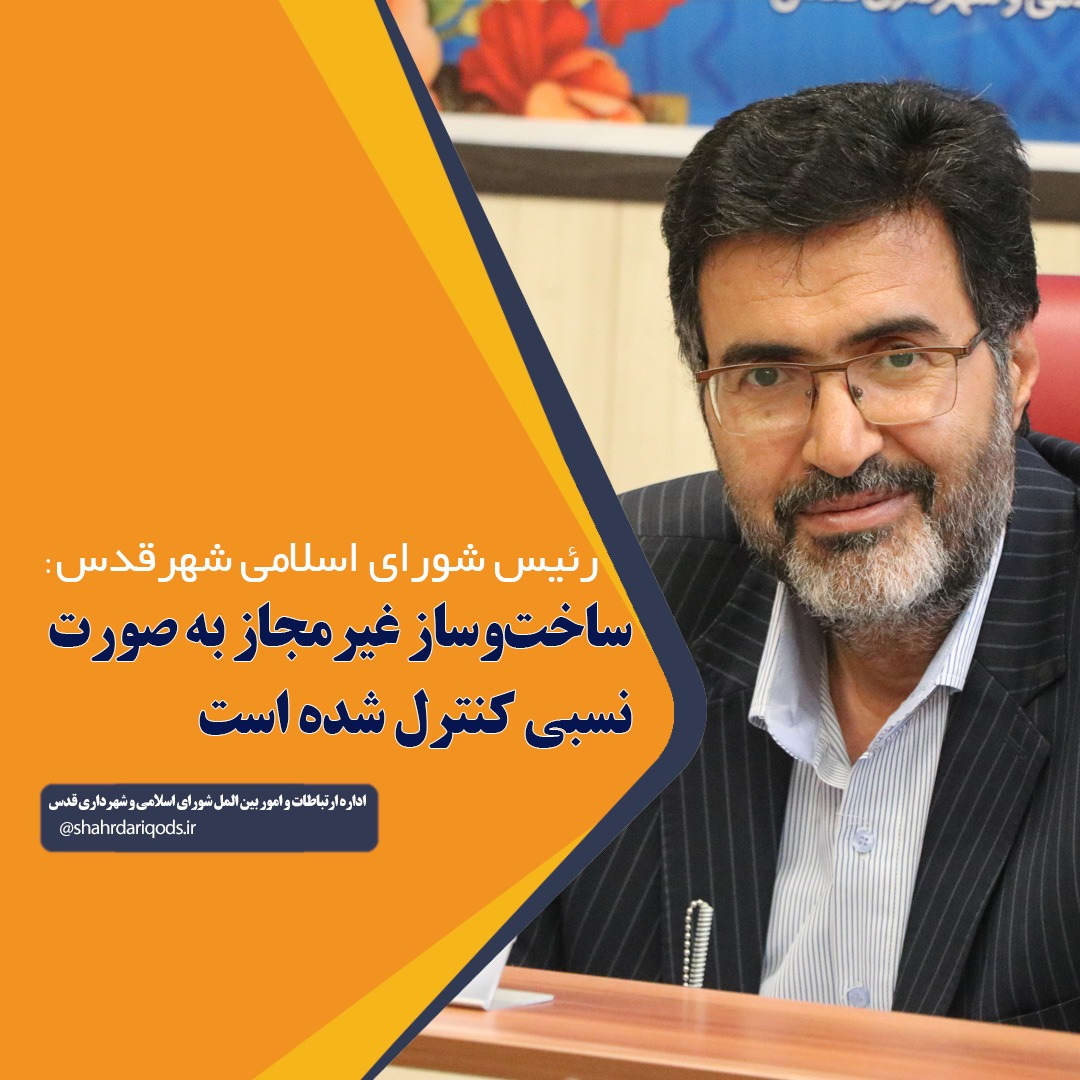 رئیس شورای اسلامی شهرقدس با بیان اینکه شهرهایی همچون شهرقدس که فاقد اسناد مالکیت رسمی هستند، با مشکل ساخت‌وساز غیرمجاز مواجهند، گفت: ساخت و ساز غیرمجاز به صورت نسبی در شهرقدس کنترل شده است.