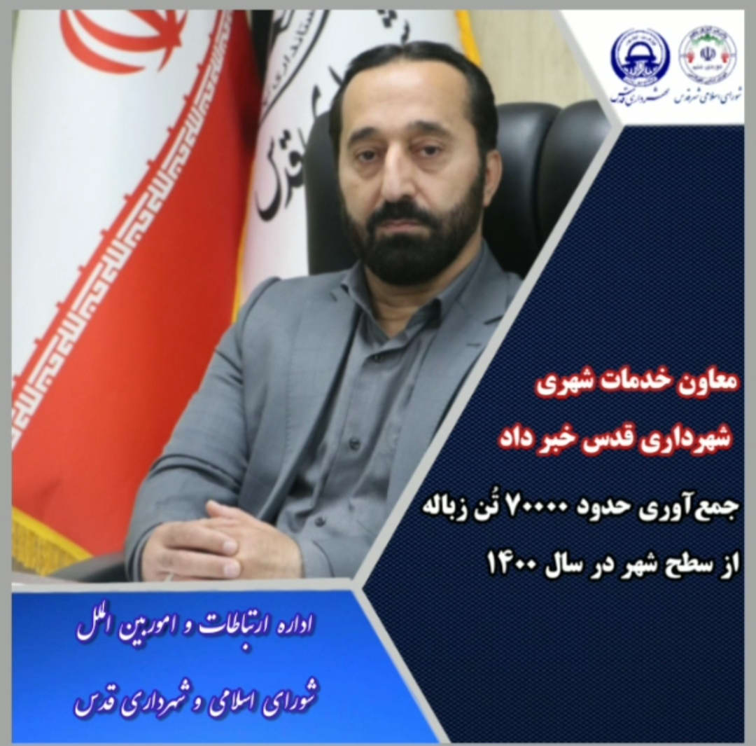 معاون خدمات شهری شهرداری قدس از جمع‌آوری بیش از 69هزار تُن زباله در قالب 26 هزار سرویس به شیوه دستی و مکانیزه و انتقال به گود زباله در سال 1400 توسط حوزه خدمات شهری شهرداری خبر داد.