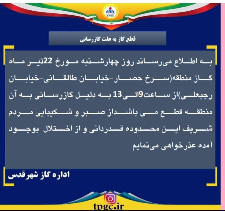 گاز بعلت گازرسانی به مناطق در شهرستان قدس از ساعت 9 الی 13 قطع خواهد شد.