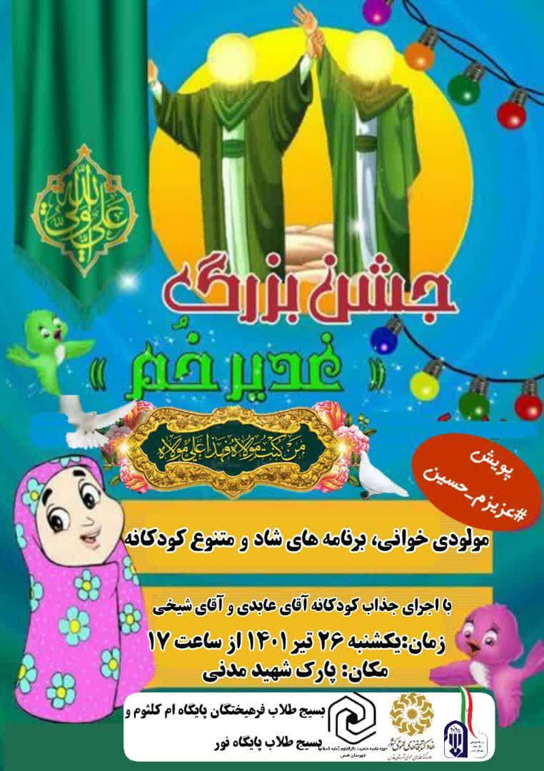به مناسبت عیدغدیرخم \"جشن بزرگ غدیر\" همراه با برنامه های متنوع ومسابقه درپارک شهید مدنی برگزار می شود.